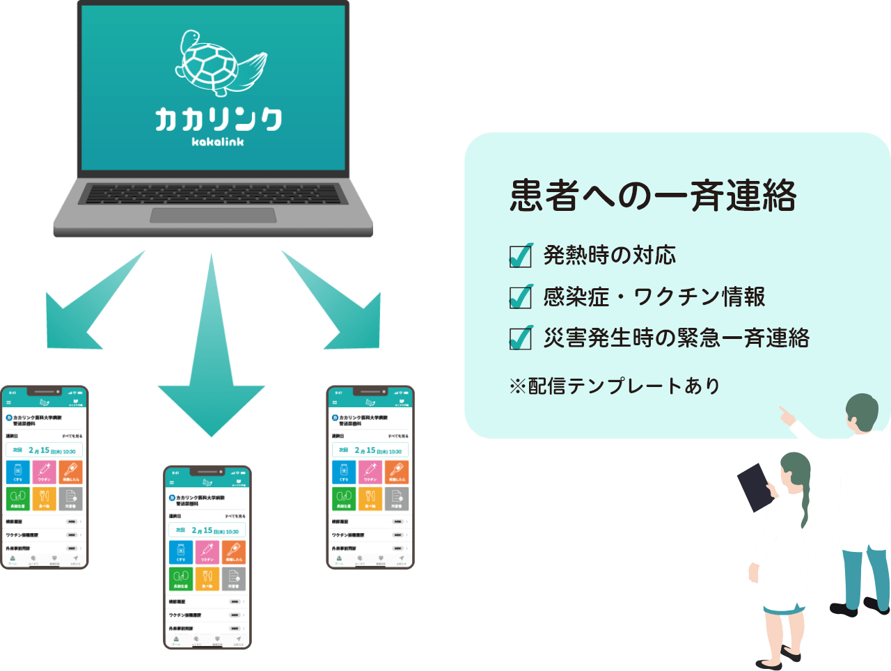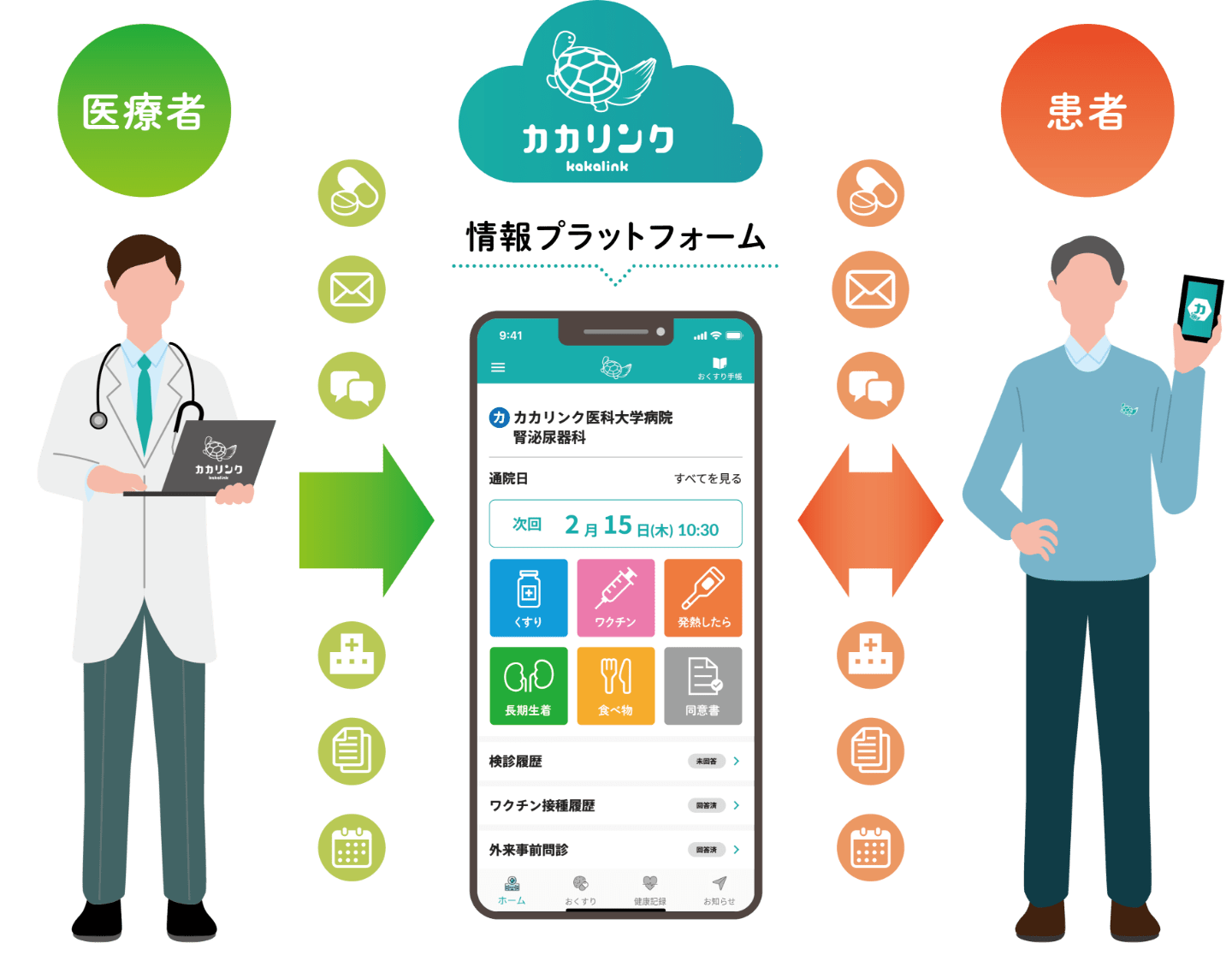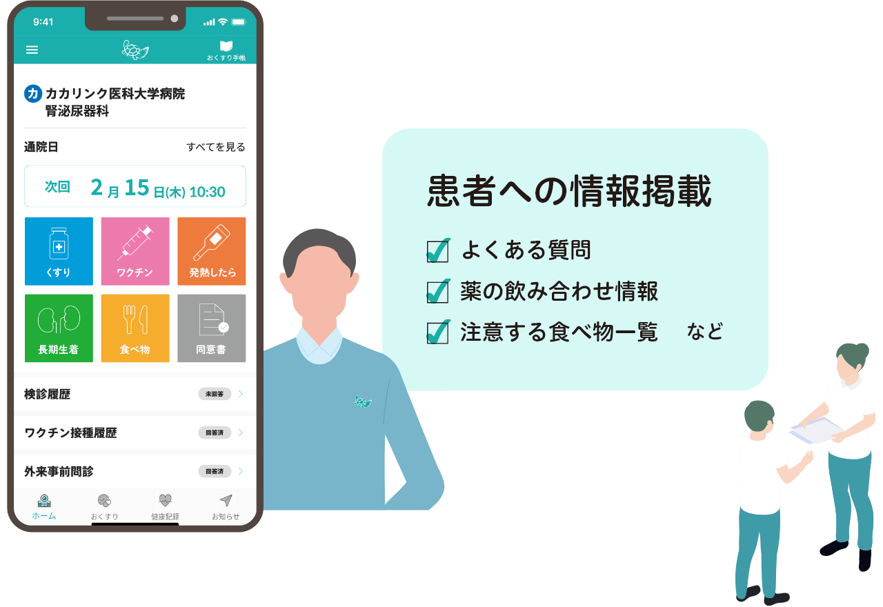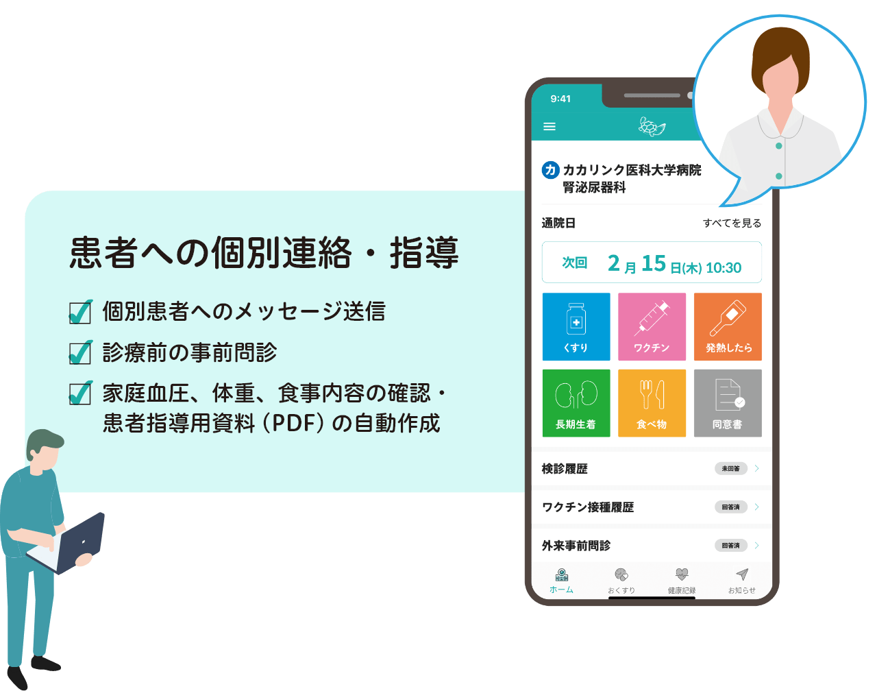 カカリンク®を活用することで、患者への情報提供や管理、指導がスムーズに行え、医療従事者の業務負担軽減と業務効率の向上が期待できます。